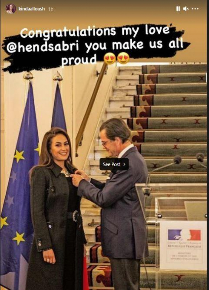 هنأت الفنانة كندة علوش، صديقتها الفنانة هند صبري، بعد تسلمها وسام الفنون والآداب الفرنسي من درجة ضابط Officier des art etblettres، من السفير الفرنسي بالقاهرة.
