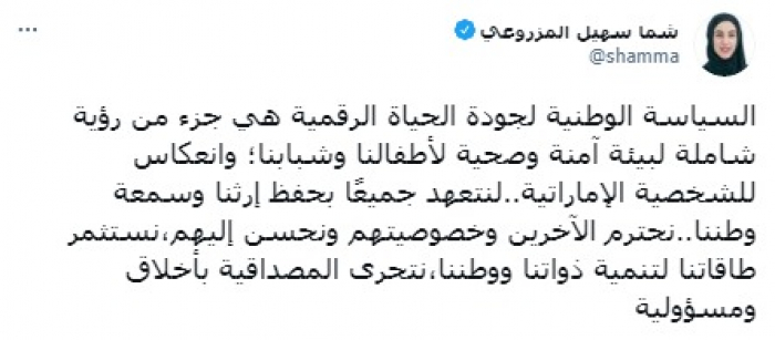 وأشارت في تغريدة على حسابها بموقع التدوين المصغر تويتر، اليوم إلى أن: "السياسة الوطنية لجودة الحياة الرقمية هي جزء من رؤية شاملة لبيئة آمنة وصحية لأطفالنا وشبابنا؛ وانعكاس للشخصية الإماراتية".