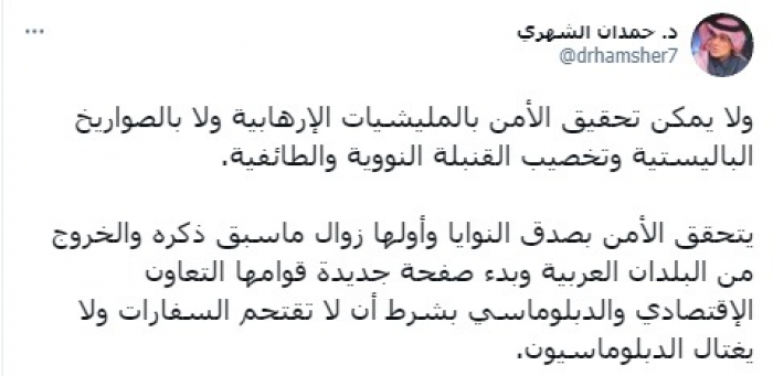 وأكد في تغريدة على حسابه بموقع التدوين المصغر تويتر، اليوم أنه: "لا يمكن تحقيق الأمن بالمليشيات الإرهابية ولا بالصواريخ الباليستية وتخصيب القنبلة النووية والطائفية".