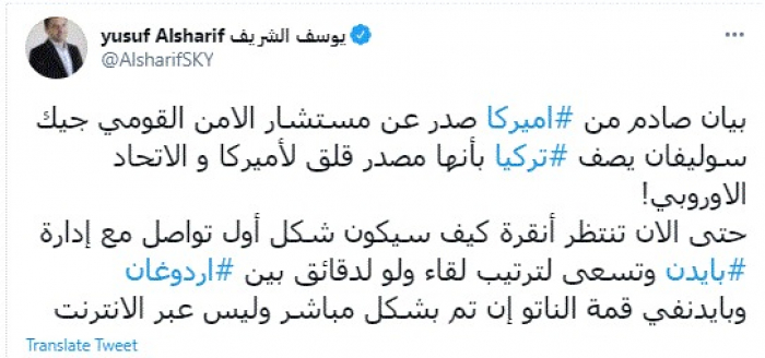 وكتب في تغريدة عبر "تويتر" رصدها "المشهد العربي": "بيان صادم من أمريكا صدر عن مستشار الأمن القومي جيك سوليفان يصف تركيا بأنها مصدر قلق لأمريكا والاتحاد الأوروبي".