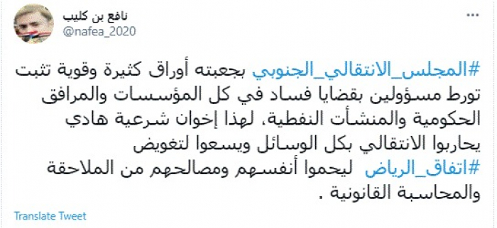 وكتب في تغريدة عبر "تويتر" رصدها "المشهد العربي": "المجلس الانتقالي الجنوبي بجعبته أوراق كثيرة وقوية تثبت تورط مسؤولين بقضايا فساد في كل المؤسسات والمرافق الحكومية والمنشآت النفطية".