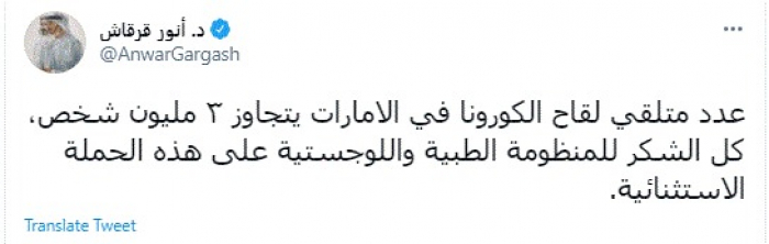 وكتب في تغريدة عبر "تويتر" رصدها "المشهد العربي": "عدد متلقي لقاح الكورونا في الامارات يتجاوز ٣ مليون شخص، كل الشكر للمنظومة الطبية واللوجستية على هذه الحملة الاستثنائية".