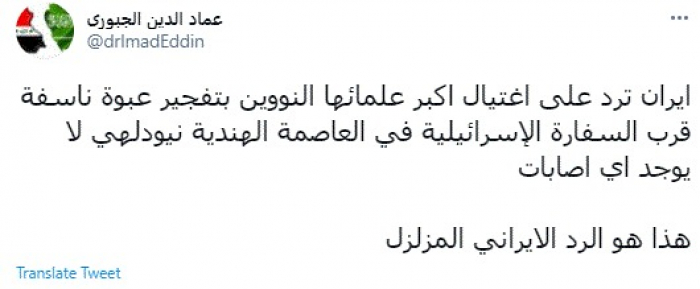 وقال في تغريدة عبر "تويتر" رصدها "المشهد العربي": "إيران ترد على اغتيال أكبر علمائها النووين بتفجير عبوة ناسفة قرب السفارة الإسرائيلية في العاصمة الهندية نيودلهي لا يوجد أي إصابات هذا هو الرد الإيراني المزلزل".