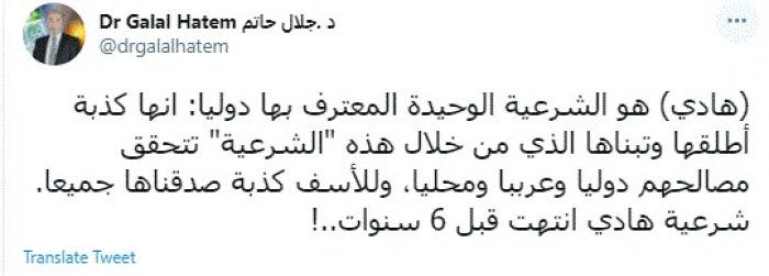 وقال في تغريدة عبر "تويتر" رصدها "المشهد العربي": "(هادي) هو الشرعية الوحيدة المعترف بها دوليًا: إنها كذبة أطلقها وتبناها الذي من خلال هذه الشرعية تتحقق مصالحهم دوليًا وعربيًا ومحليًا، وللأسف كذبة صدقناها جميعًا".