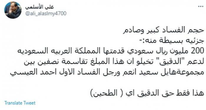 وكتب في تغريدة عبر "تويتر" رصدها "المشهد العربي": "حجم الفساد كبير وصادم جزئية بسيطة منه:- 200 مليون ريال سعودي قدمتها المملكة العربيه السعوديه لدعم "الدقيق" تخيلوا أن هذا المبلغ تقاسمة نصفين بين مجموعة هايل سعيد أنعم ورجل الفساد الأول أحمد العيسي هذا فقط حق الدقيق أي (الطحين)".