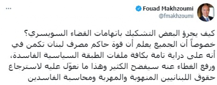 وتساءل في تغريدة على حسابه بموقع التدوين المصغر تويتر، اليوم قائلا: "كيف يجرؤ البعض التشكيك باتهامات القضاء السويسري؟ خصوصًا أن الجميع يعلم أن قوة حاكم مصرف لبنان تكمن في أنه على دراية تامة بكافة ملفات الطبقة السياسية الفاسدة".