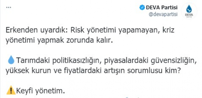 اتهم حزب ديفا التركي المعارض الرئيس رجب طيب أردوغان بالتسبب في انعدام الأمن وارتفاع أسعار الصرف والأزمات التي تعيشها تركيا نتيجة لإدارته التعسفية.