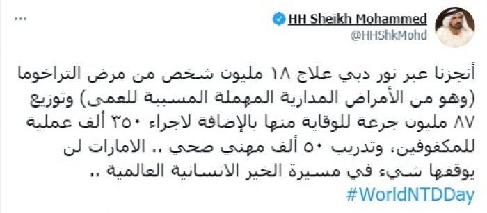 وأوضح في تغريدة على حسابه بموقع التدوين المصغر تويتر، اليوم أنه: "أنجزنا عبر نور دبي علاج 18 مليون شخص من مرض التراخوما (وهو من الأمراض المدارية المهملة المسببة للعمى)".