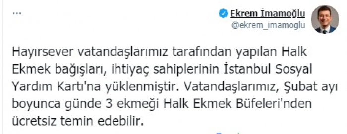 وقال في تغريدة على حسابه بموقع التدوين المصغر تويتر، اليوم إنه: "يتم تحميل تبرعات الخبز العامة التي يقدمها مواطنونا الخيريون على بطاقة المساعدة الاجتماعية في إسطنبول للأشخاص المحتاجين".