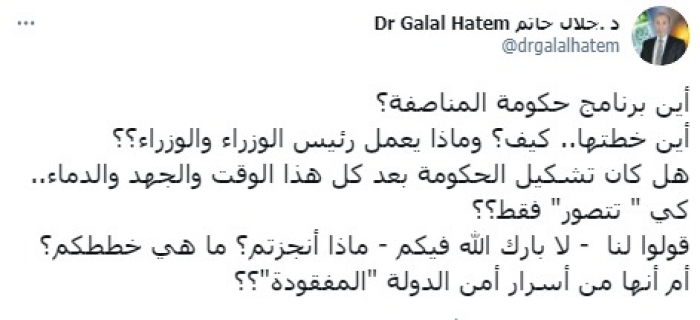 استهجن الأكاديمي جلال حاتم غياب برنامج عمل حكومة المناصفة منذ وصولها إلى العاصمة عدن، على الرغم من الدماء في سبيل تشكيلها.