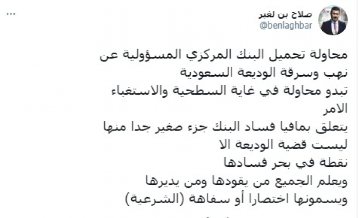 وأكد في تغريدة على حسابه بموقع التدوين المصغر تويتر، اليوم أن: "محاولة تحميل البنك المركزي المسؤولية عن نهب وسرقة الوديعة السعودية، تبدو محاولة في غاية السطحية والاستغباء".