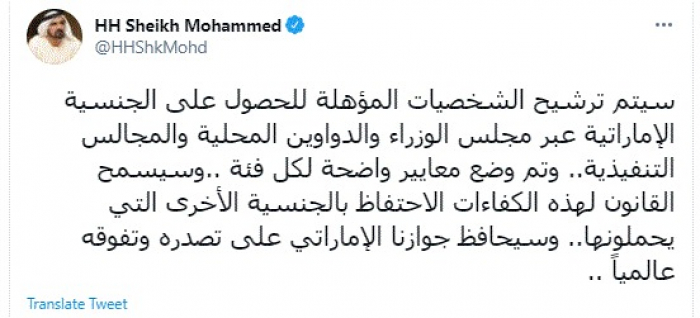 وأضاف: "سيتم ترشيح الشخصيات المؤهلة للحصول على الجنسية الإماراتية عبر مجلس الوزراء والدواوين المحلية والمجالس التنفيذية.. وتم وضع معايير واضحة لكل فئة ..وسيسمح القانون لهذه الكفاءات الاحتفاظ بالجنسية الأخرى التي يحملونها.. وسيحافظ جوازنا الإماراتي على تصدره وتفوقه عالمياً".