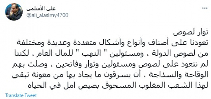 وقال في تغريدة عبر "تويتر" رصدها "المشهد العربي": "ثوار لصوص تعودنا على أصناف وأنواع وأشكال متعددة وعديدة ومختلفة من لصوص الدولة، ومسؤولين النهب للمال العام".