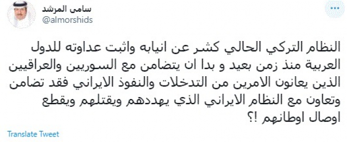 وقال في تغريدة عبر "تويتر" رصدها "المشهد العربي": "النظام التركي الحالي كشر عن أنيابه وأثبت عداوته للدول العربية منذ زمن بعيد و بدل أن يتضامن مع السوريين والعراقيين الذين يعانون الأمرين من التدخلات والنفوذ الإيراني فقد تضامن وتعاون مع النظام الإيراني الذي يهددهم ويقتلهم ويقطع أوصال أوطانهم".