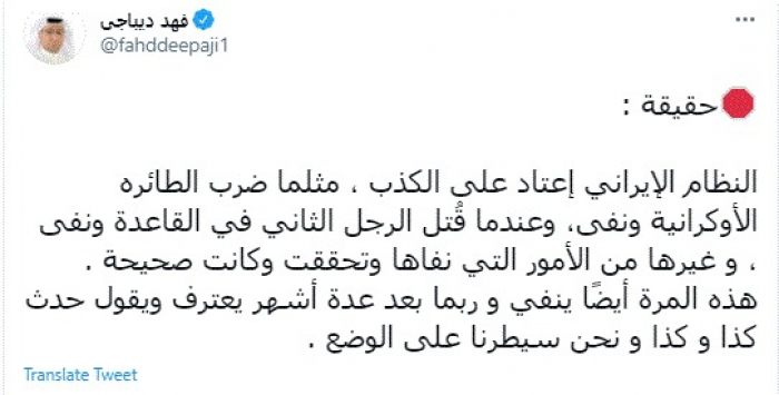 وقال في تغريدة عبر "تويتر" رصدها "المشهد العربي": "النظام الإيراني اعتاد على الكذب، مثلما ضرب الطائرة الأوكرانية ونفى، وعندما قُتل الرجل الثاني في القاعدة ونفى، و غيرها من الأمور التي نفاها وتحققت وكانت صحيحة".