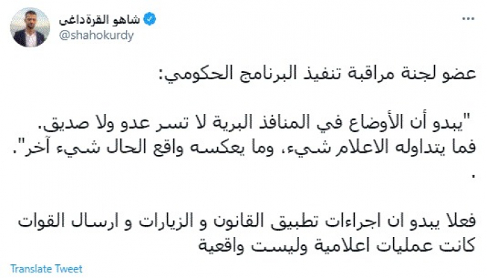 انتقد الكاتب الصحفي العراقي شاهو القرةداغي، اليوم، استمرار سياسة المراوغة في ضبط الأوضاع بالمنافذ البرية بالعراق.