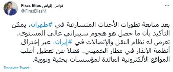 وقال في تغريدة عبر "تويتر" رصدها "المشهد العربي": "بعد متابعة تطورات الأحداث المتسارعة في طهران، يمكن التأكيد بأن ما حصل هو هجوم سيبراني عالي المستوى، تعرض له نظام النقل والإتصالات في إيران، عبر إختراق أنظمة الإنذار في مطار الخميني، فضلا عن تعطيل أغلب المواقع الألكترونية العائدة لمؤسسات بحثية ونووية".