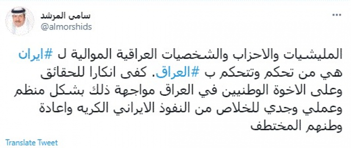 وأضاف: "كفى انكارا للحقائق وعلى الأخوة الوطنيين في العراق مواجهة ذلك بشكل منظم وعملي وجدي للخلاص من النفوذ الإيراني الكريه وإعادة وطنهم المختطف".