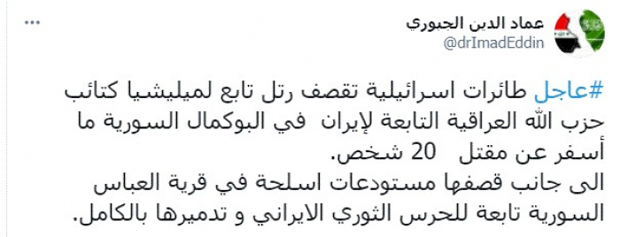 وقال في تغريدة عبر "تويتر" رصدها "المشهد العربي": "عاجل طائرات اسرائيلية تقصف رتل تابع لميليشيا كتائب حزب الله العراقية التابعة لإيران في البوكمال السورية ما أسفر عن مقتل 20 شخص. إلى جانب قصفها مستودعات أسلحة في قرية العباس السورية تابعة للحرس الثوري الايراني وتدميرها بالكامل".