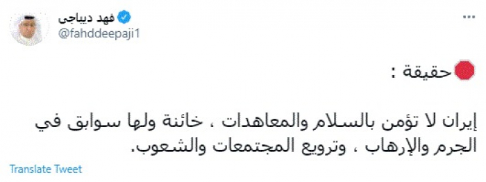 وقال في تغريدة عبر "تويتر" رصدها "المشهد العربي": "إيران لا تؤمن بالسلام والمعاهدات، خائنة ولها سوابق في الجرم والإرهاب، وترويع المجتمعات والشعوب"