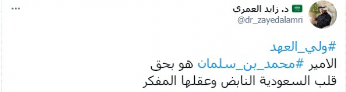 وقال في تغريدة عبر "تويتر" رصدها "المشهد العربي": "ولي العهد الأمير محمد بن سلمان هو بحق قلب السعودية النابض وعقلها المفكر".