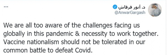 دعا وزير الدولة الإماراتي للشؤون الخارجية الدكتور أنور قرقاش، اليوم، إلى عدم التسامح مع "قومية لقاح" كوفيد 19 خلال المعركة لهزيمة الوباء.