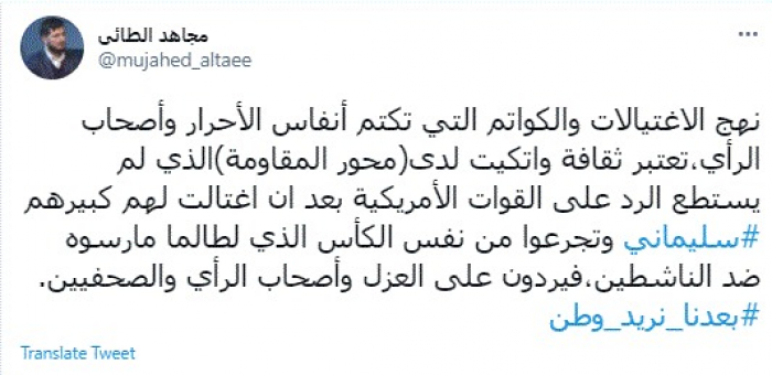 وكتب في تغريدة عبر "تويتر" رصدها "المشهد العربي": "نهج الاغتيالات والكواتم التي تكتم أنفاس الأحرار وأصحاب الرأي، تعتبر ثقافة واتكيت لدى (محور المقاومة) الذي لم يستطع الرد على القوات الأمريكية بعد أن اغتالت لهم كبيرهم سليماني وتجرعوا من نفس الكأس الذي لطالما مارسوه ضد الناشطين، فيردون على العزل وأصحاب الرأي والصحفيين".
