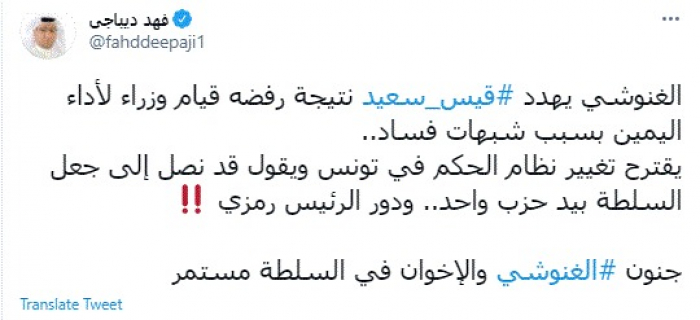 وقال في تغريدة عبر "تويتر" رصدها "المشهد العربي": "الغنوشي يهدد قيس سعيد نتيجة رفضه قيام وزراء لأداء اليمين بسبب شبهات فساد.. يقترح تغيير نظام الحكم في تونس ويقول قد نصل إلى جعل السلطة بيد حزب واحد.. ودور الرئيس رمزي".