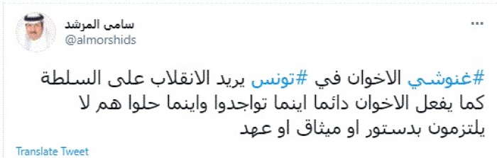 وكتب في تغريدة عبر "تويتر" رصدها "المشهد العربي": "غنوشي الإخوان في تونس يريد الانقلاب على السلطة كما يفعل الإخوان دائما أينما تواجدوا وأينما حلوا هم لا يلتزمون بدستور أو ميثاق أو عهد".