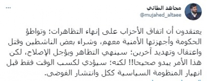 وأشار في تغريدة على حسابه بموقع التدوين المصغر تويتر، اليوم إلى أنهم: "يعتقدون أن اتفاق الأحزاب على إنهاء التظاهرات؛ وتواطؤ الحكومة وأجهزتها الأمنية معهم، وشراء بعض الناشطين وقتل واعتقال وتهديد آخرين؛ سينهي التظاهر ويؤجل الإصلاح".