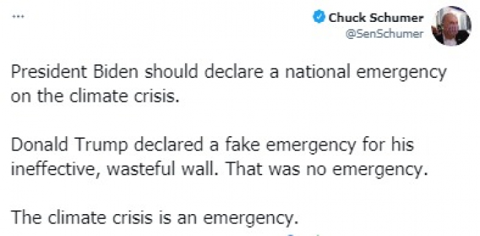 وقال في تغريدة على حسابه بموقع التدوين المصغر تويتر اليوم إنه: "يجب على الرئيس بايدن إعلان حالة الطوارئ الوطنية بشأن أزمة المناخ".