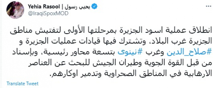 وقال في تغريدة عبر "تويتر" رصدها "المشهد العربي": "انطلاق عملية أسود الجزيرة بمرحلتها الأولى لتفتيش مناطق الجزيرة غرب البلاد، وتشترك فيها قيادات عمليات الجزيرة وصلاح الدين وغرب نينوى بتسعة محاور رئيسية، وبإسناد من قبل القوة الجوية وطيران الجيش للبحث عن العناصر الارهابية في المناطق الصحراوية وتدمير أوكارهم".