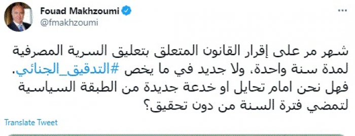 وقال في تغريدة عبر "تويتر" رصدها "المشهد العربي": "شهر مر على إقرار القانون المتعلق بتعليق السرية المصرفية لمدة سنة واحدة، ولا جديد في ما يخص التدقيق الجنائي. فهل نحن أمام تحايل أو خدعة جديدة من الطبقة السياسية لتمضي فترة السنة من دون تحقيق؟".