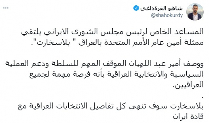 وقال في تغريدة عبر "تويتر" رصدها "المشهد العربي": "المساعد الخاص لرئيس مجلس الشورى الإيراني يلتقي ممثلة أمين عام الأمم المتحدة بالعراق بلاسخارت. ووصف أمير عبد اللهيان الموقف المهم للسلطة ودعم العملية السياسية والانتخابية العراقية بأنه فرصة مهمة لجميع العراقيين".