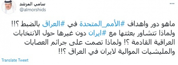 وقال في تغريدة عبر "تويتر" رصدها "المشهد العربي": "ما هو دور وأهداف الأمم المتحدة في العراق بالضبط ؟ ولماذا تتشاور بعثتها مع إيران دون غيرها حول الانتخابات العراقية القادمة؟! ولماذا تصمت على جرائم العصابات والمليشيات الموالية لايران في العراق؟".