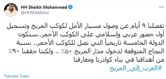 وقال في تغريدة عبر "تويتر" رصدها "المشهد العربي": "تفصلنا ٩ أيام عن وصول مسبار الأمل لكوكب المريخ وتسجيل أول حضور عربي وإسلامي على الكوكب الأحمر..سنكون الدولة الخامسة تاريخياً التي تصل للكوكب الأحمر.. نسبة النجاح المتوقعة لدخول مدار المريخ ٥٠٪ .. ولكننا حققنا ٩٠٪ من أهدافنا في بناء كوادرنا ومعارفنا".