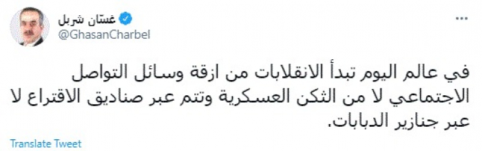 وقال في تغريدة عبر "تويتر" رصدها "المشهد العربي": "في عالم اليوم تبدأ الانقلابات من ازقة وسائل التواصل الاجتماعي لا من الثكن العسكرية وتتم عبر صناديق الاقتراع لا عبر جنازير الدبابات".