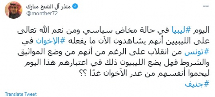 دعا المدون السعودي البارز منذر آل الشيخ مبارك، اليوم، الشعب الليبي لحماية أنفسهم من غدر جماعة الإخوان.