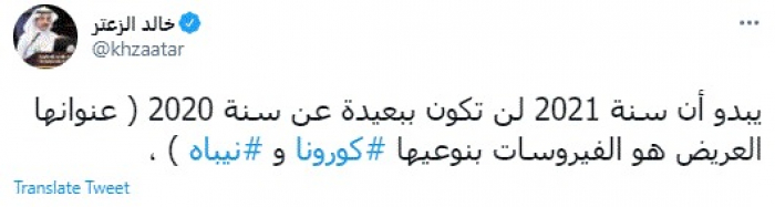 وقال في تغريدة عبر "تويتر" رصدها "المشهد العربي": "يبدو أن سنة 2021 لن تكون ببعيدة عن سنة 2020 (عنوانها العريض هو الفيروسات بنوعيها كورونا و نيباه)".