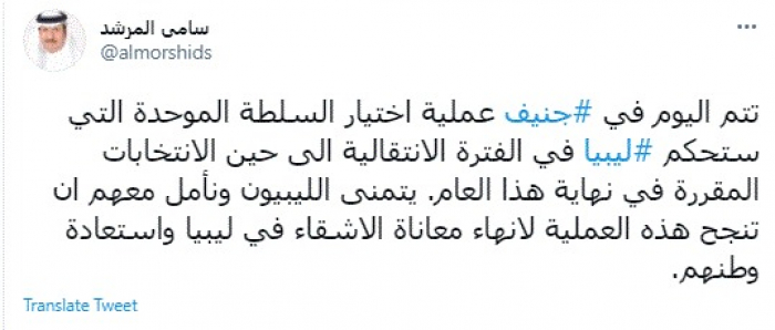 وقال في تغريدة عبر "تويتر" رصدها "المشهد العربي": "تتم اليوم في جنيف عملية اختيار السلطة الموحدة التي ستحكم ليبيا في الفترة الانتقالية إلى حين الانتخابات المقررة في نهاية هذا العام. يتمنى الليبيون ونأمل معهم أن تنجح هذه العملية لإنهاء معاناة الأشقاء في ليبيا واستعادة وطنهم".