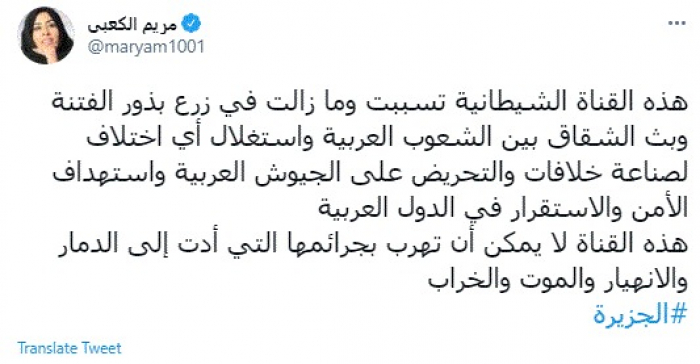 وجهت الإعلامية الإماراتية مريم الكعبي، اليوم، انتقادًا لاذعًا لقناة الجزيرة القطرية، مؤكدةً أنها تواصل استهداف الدول العربية والعبث باستقرارها.