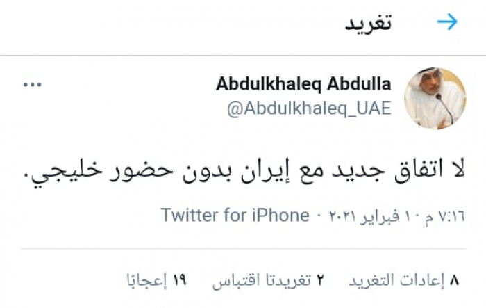 وقال في تغريدة على حسابه بموقع التدوين المصغر تويتر اليوم إنه: "لا اتفاق جديد مع إيران بدون حضور خليجي".