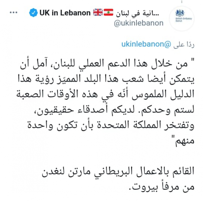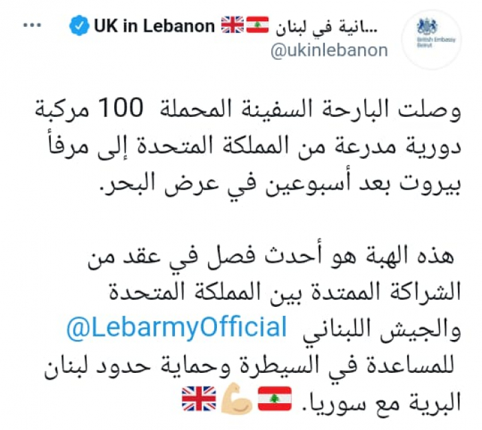 وأعلن في تغريدة على حساب السفارة البريطانية في لبنان بموقع التدوين المصغر تويتر اليوم "وصول السفينة المحملة 100 مركبة دورية مدرعة من المملكة المتحدة إلى مرفأ بيروت بعد أسبوعين في عرض البحر".