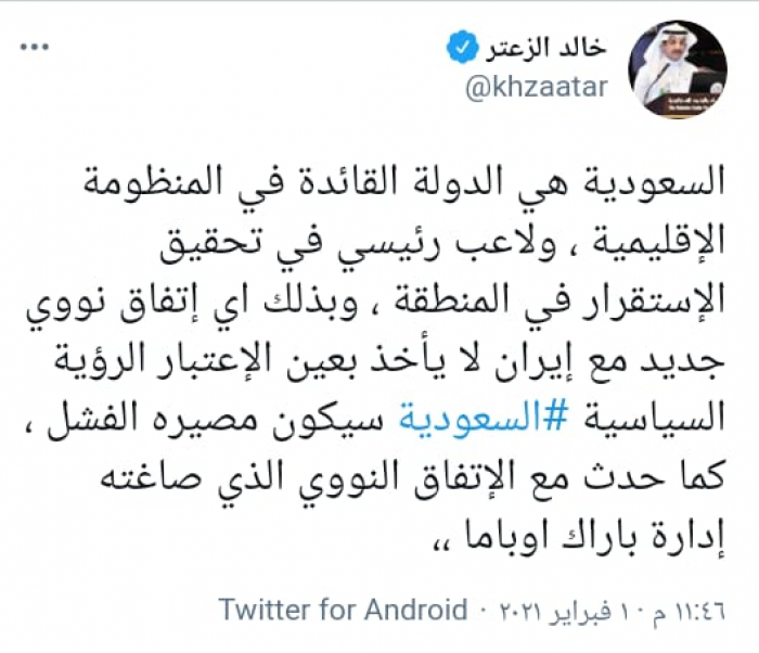 وتابع: "وبذلك أي إتفاق نووي جديد مع إيران لا يأخذ بعين الإعتبار الرؤية السياسية السعودية سيكون مصيره الفشل، كما حدث مع الاتفاق النووي الذي صاغته إدارة باراك أوباما".