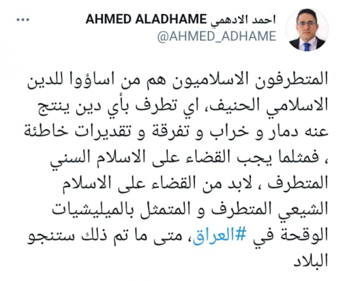 طالب الكاتب الصحفي أحمد الأدهمي بالقضاء على التطرف الشيعي في العراق المتمثل بالمليشيات الموالية لإيران.