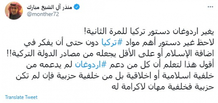 وقال في تغريدة عبر "تويتر" رصدها "المشهد العربي": "يغير أردوغان دستور تركيا للمرة الثانية.. لاحظ غير دستور أهم مواد تركيا دون حتى أن يفكر في اضافة الإسلام أو على الأقل يجعله من مصادر الدولة التركية".