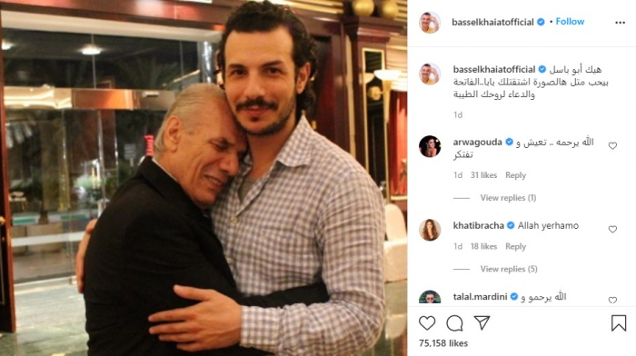 ونشر خياط، صورة تجمعه بوالده عبر حسابه على إنستجرام، وعلق: "هيك أبو باسل بيحب مثل هذه الصورة.. اشتقتلك بابا.. الفاتحة والدعاء لروحك الطيبة".
