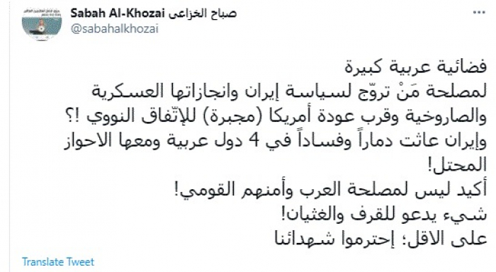 وقال في تغريدة عبر "تويتر" رصدها "المشهد العربي": "فضائية عربية كبيرة لمصلحة مَنْ تروّج لسياسة إيران وانجازاتها العسكرية والصاروخية وقرب عودة أمريكا (مجبرة) للإتّفاق النووي! وإيران عاثت دماراً وفساداً في 4 دول عربية ومعها الاحواز المحتل" – في إشارة لقناة الجزيرة القطرية-.