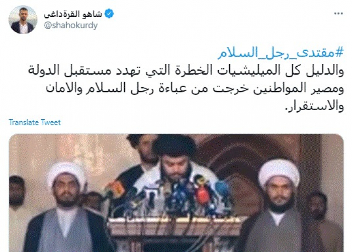 وقال في تغريدة عبر "تويتر" رصدها "المشهد العربي": "مقتدى رجل السلام والدليل كل الميليشيات الخطرة التي تهدد مستقبل الدولة ومصير المواطنين خرجت من عباءة رجل السلام والامان والاستقرار".