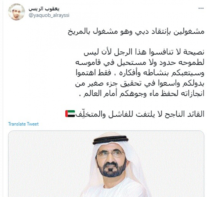 وقال في تغريدة عبر "تويتر" رصدها "المشهد العربي": "مشغولين بإنتقاد دبي وهو مشغول بالمريخ نصيحة لا تنافسوا هذا الرجل لأن ليس لطموحه حدود ولا مستحيل في قاموسه وسيتعبكم بنشاطه وأفكاره، فقط اهتموا بدولكم واسعوا في تحقيق جزء صغير من إنجازاته لحفظ ماء وجوهكم أمام العالم.. القائد الناجح لا يلتفت للفاشل والمتخلِّف".